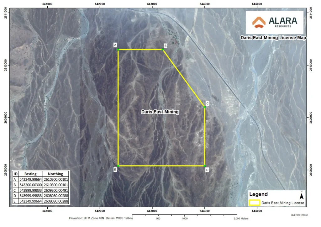 Alara first conducted exploration at Daris East between 2010 and 2012, successfully defining copper-gold resources in the area. A mining license application, originally submitted in 2012, remains under review for approval.