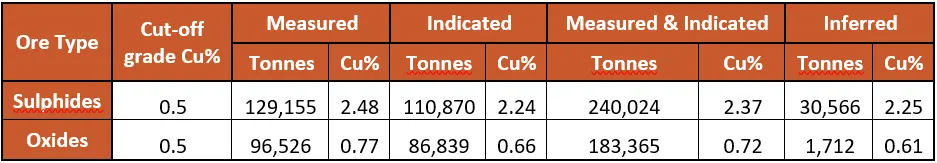 Daris East (measured and indicated): 240,024 tonnes @ 2.37% Cu. JORC Code 2004 Compliant